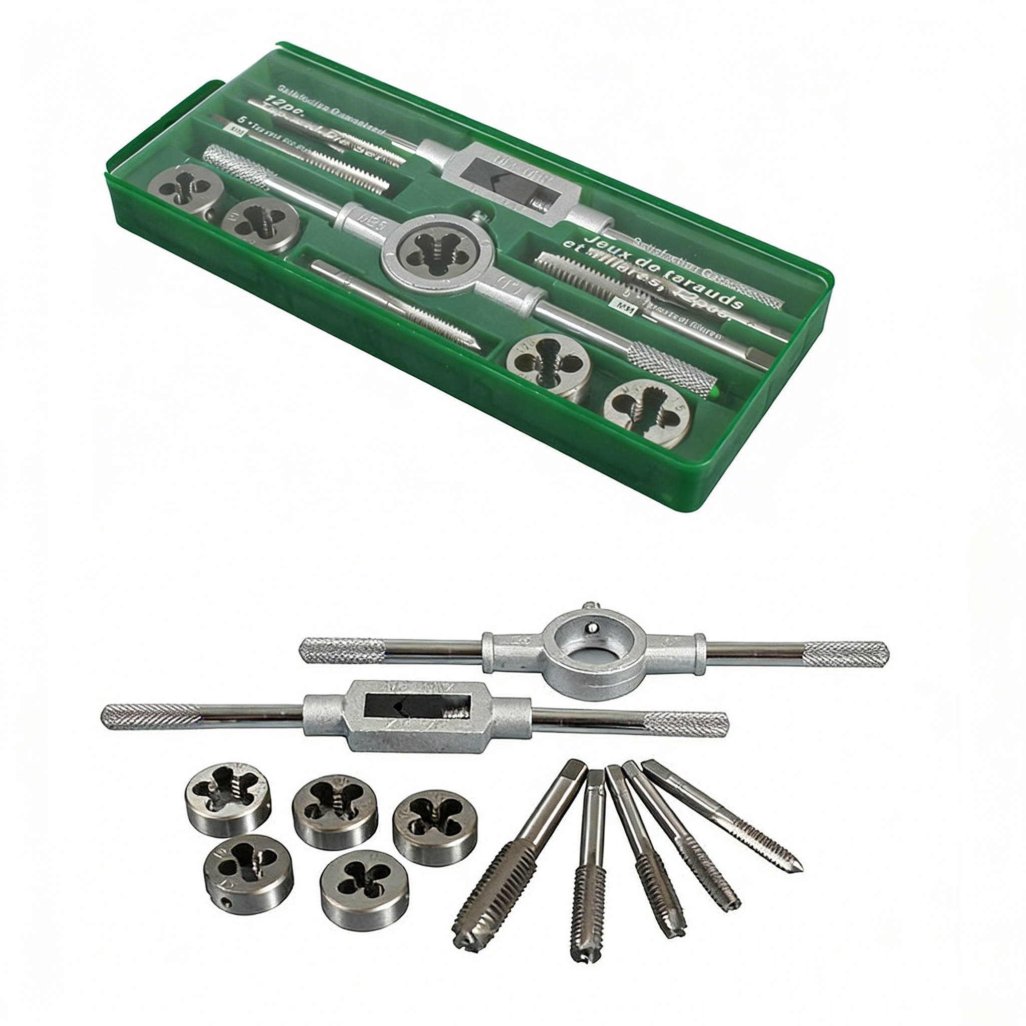 METRIC5PC Taps size:M5×0.8, M6×1.0, M8×1.25, M10×1.5, M12×1.755PC Die:same size as taps1PC Die Handle:1"OD1PC Tap Wrench:M3-M12SAE5PC Taps size:1/4NC20, 5/16NC18, 3/8NC16, 7/16NC14, 1/2NC135PC Di