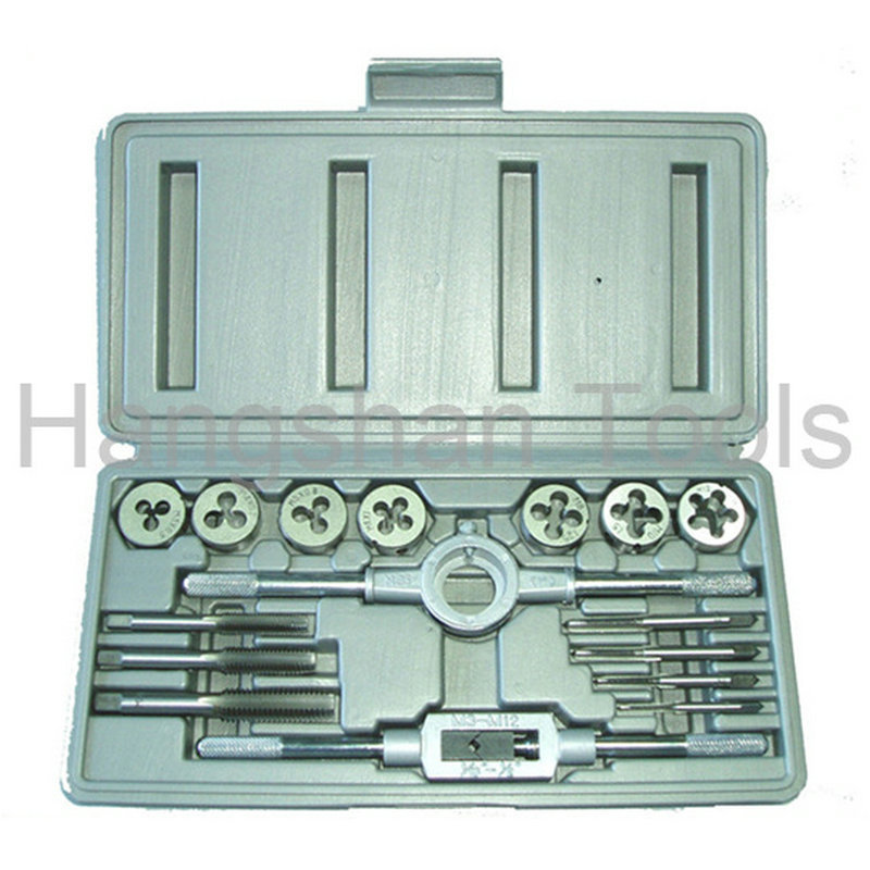 METRIC7PC Dies size:M3×0.5, M4×0.7, M5×0.8, M6×1.0, M8×1.25, M10×1.5, M12×1.757PC Taps:same size as dieDie handle:1"OD1PC Tap Wrench M3-M12SAE7PC Taps size:6-32, 8-32, 1/4-20, 5/16-18, 3/8-16, 7/